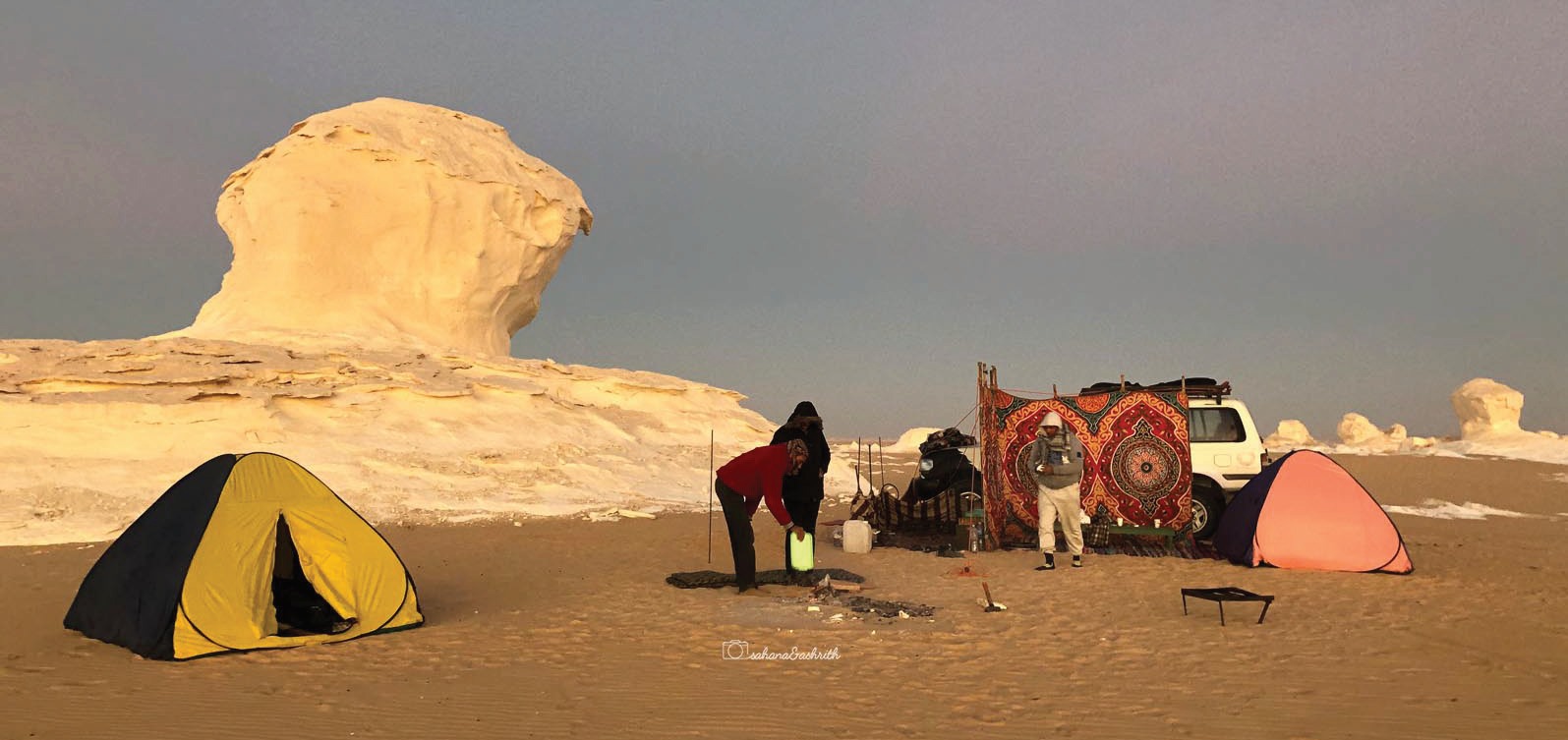 Bivouac dans le Désert Blanc d’Égypte, au cœur des formations calcaires spectaculaires.